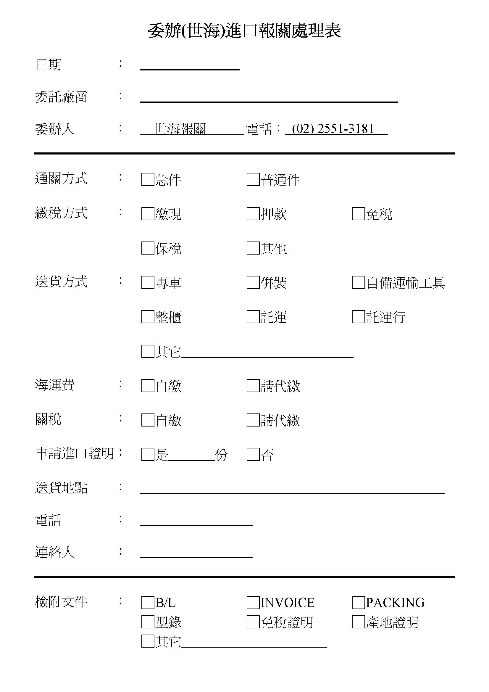 委辦進口報關處理表